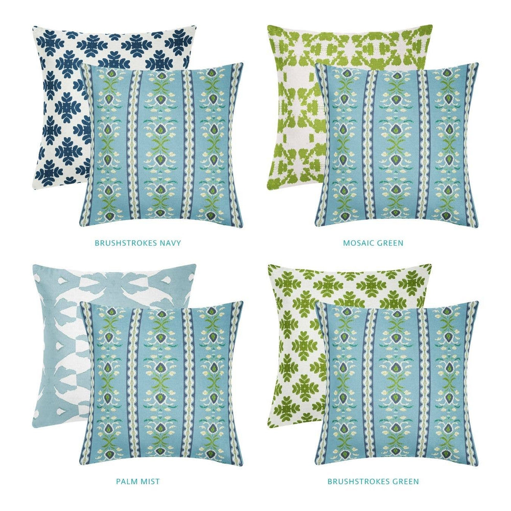 Refined linen-cotton pillow with a striking rosemary stripe in French blue. Features a double-sided print, concealed zipper, and plush feather-down insert. Made in the USA. 22x22.